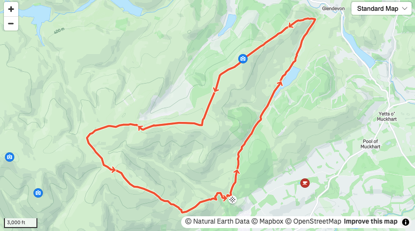 Park high up Dollar glen by Castle Campbell and follow the track north east up through the glen towards Glendevon. If you were after a shorter route you could ignore this section and head north straight up Whitewisp hill, to pick up the second half of the route.