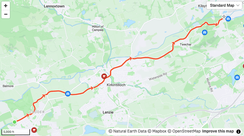 There are plenty of places to park along the length of this canal, and the canal stretches significantly longer in both directions than shown on the map, the image just shows the section within East Dunbartonshire.