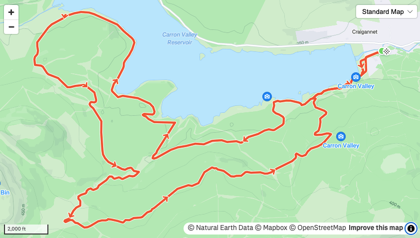 This route straddles two council regions so could also be included in Stirling. There is charged parking at the eastern end of the reservoir where the route starts. Initially follow the way-marked trail that meanders along the shores of the reservoir. There are nice views and the surface is great for easy running. You follow the trail for 2.6 miles and then take a right to keep close to the water on a newer, rougher, forestry road.