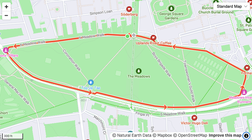 As flat as it gets with decently wide paths, it is a go to session location for Edinburgh runners. Also a good recovery run spot.