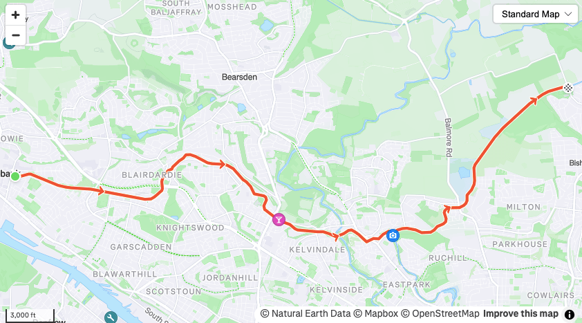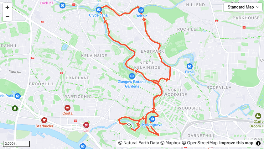 An 8 mile run along a quiet section of the Kelvin Walkway and back along the canal. Muddy when wet.