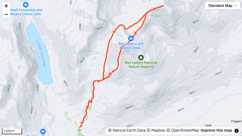 There is a large car park, with charge, high up above Loch Tay and from here you can do the Ben Lawers range or the popular Meall nan Tarmachan. Follow signs for the Ben Lawers route and just follow the obvious path up the hill, cresting Beinn Ghlas for the first of two munros. Continue on to the final steeper pull up the the fairly small summit of Ben Lawers, dominated by a large cairn and a trig.