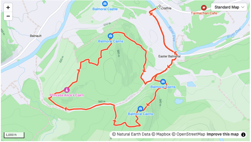 Follow the track west, downhill, and pick up a smaller trail on the right hand side, ignoring the first one that heads right up the hill and taking the second one at 2.8 miles. This will take you past Alice’s cairn and at 3.3 miles head right to see Arthur’s cairn which has a brilliant view down over the castle. Continue to follow the path downhill, detouring to the purchase cairn and Louise’s if you wish and follow it back towards where you left the road for Albert’s cairn. There are a few trails that branch off this that may seem a faster route back but there are signs saying there is restricted access, I assume you can only get into these parts if you have paid, so avoid any issues and take the slightly longer option.