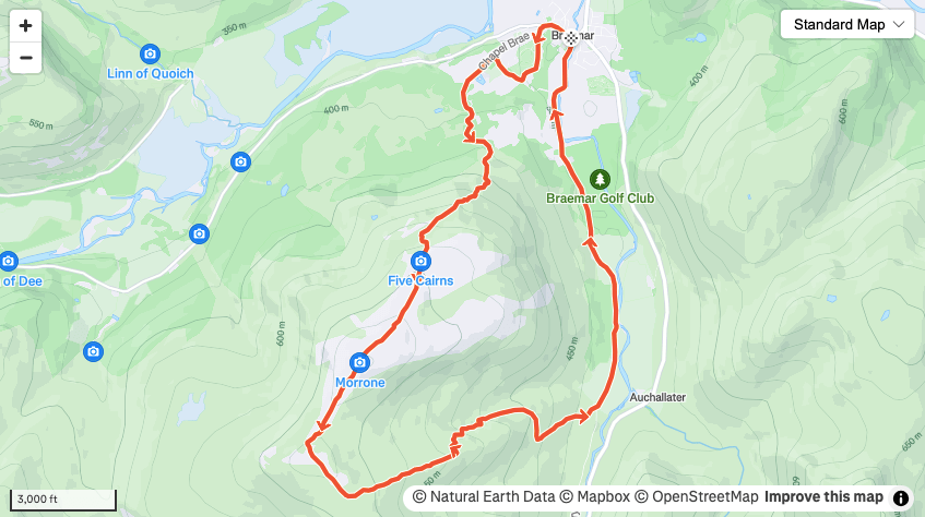Starting in the centre of Braemar, a beautiful village nestled in the heart of the cairngorm national park, head towards the Highland Games centre and have a look at the historic and world-famous location before you begin the hard work. From here there are several routes to the hill, I have mapped out following a track/road around the back of the Highland Games stadium past the duck pond and bearing left towards the main path you can see scarring the hillside.