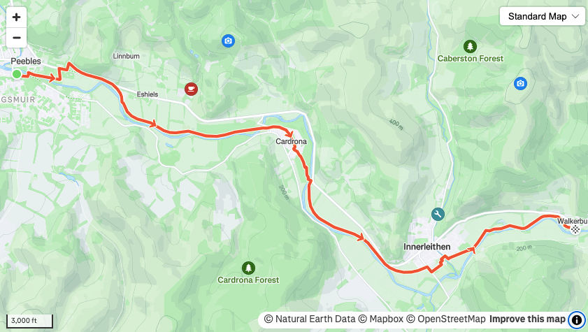A 9 mile long bike path on the old Tweed Valley Railway line. A great place for easy runs and fast runs in a quiet and scenic part of the country. The elevation given will be slightly worse on the way back as the plotted route is down river but there are no hills so it won’t be significant.