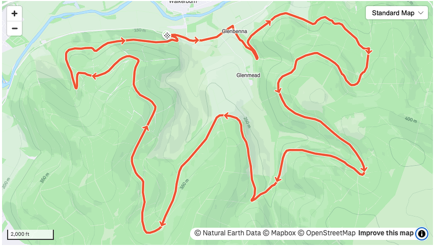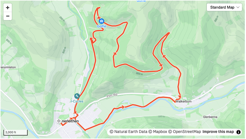 A brilliant undulating 11 mile loop with less than half a mile of tarmac and some great views over the Tweed valley. This is a personal favourite.
