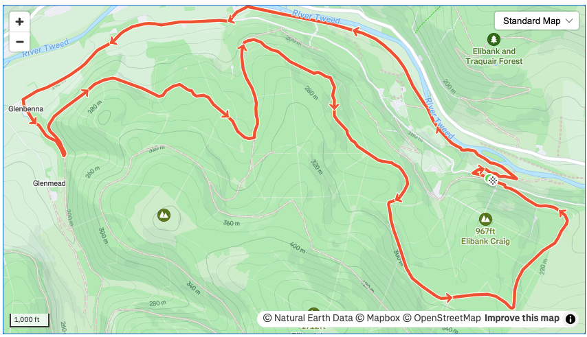 Park at the entrance to Elibank forest along the backroad between Walkerburn and Innerleithen. Head west and drop down to the Tweed, cutting through a field on a farm track. Follow the Tweed west towards Innerleithen, initially on a dirt road used by fisherman but joining the grassy remnants of the old railway. Around 2 miles in leave the railway to head up to the road. It looks like you are heading in to someone’s garden but the track is fine to follow, just close the gates.
