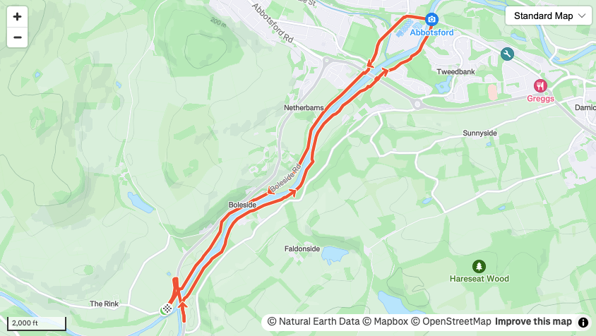 Follow the river to Abbotsford, where the paths improve to man-made manicured paths along past the impressive house. Go under the main road between Gala and Melrose, this offering a shorter return if you wish, and pick up the riverside path again out to the railway bridge over the Tweed, some sections are a little twisty.